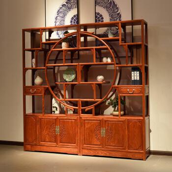 參數(shù) [型號] 質(zhì)木匠紅木家具緬甸花梨學(xué)名大果紫檀實木書架博古架多寶額置物架儲物架古董架團圓博古架 【團圓博古架】