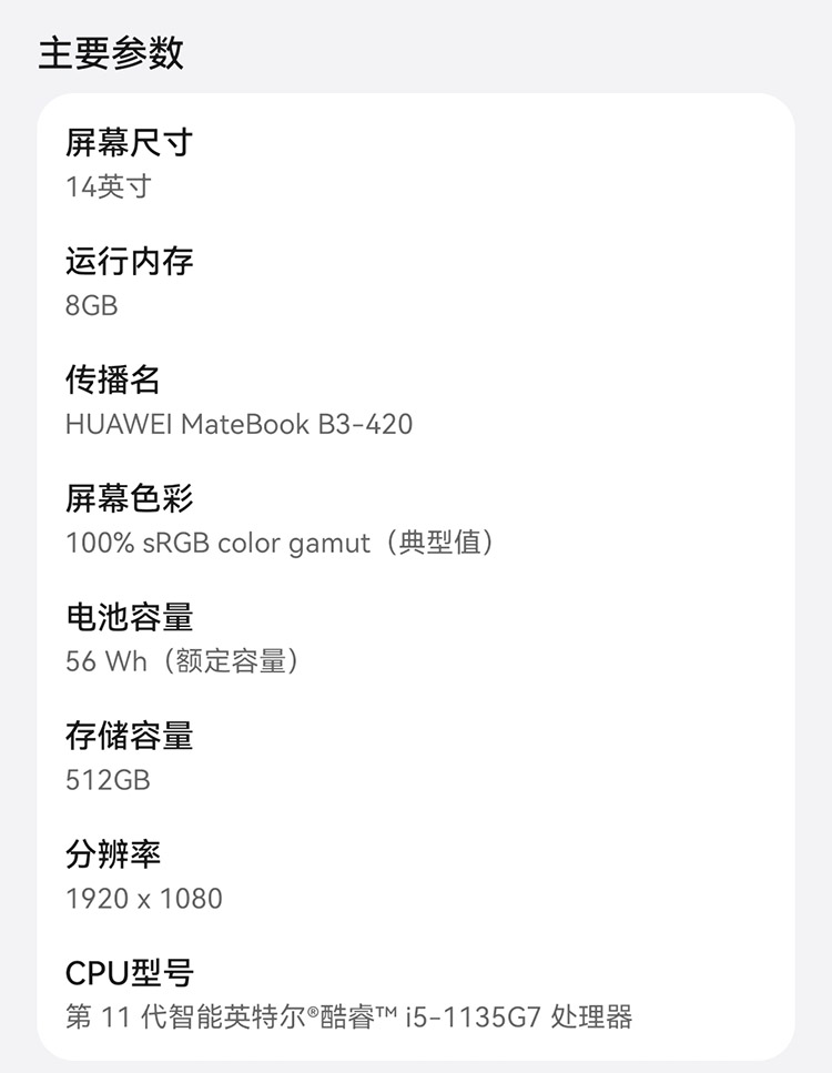 參數(shù) [型號(hào)] MateBook B3-420 [毛重] 1.38Kg [單位] 臺(tái)
