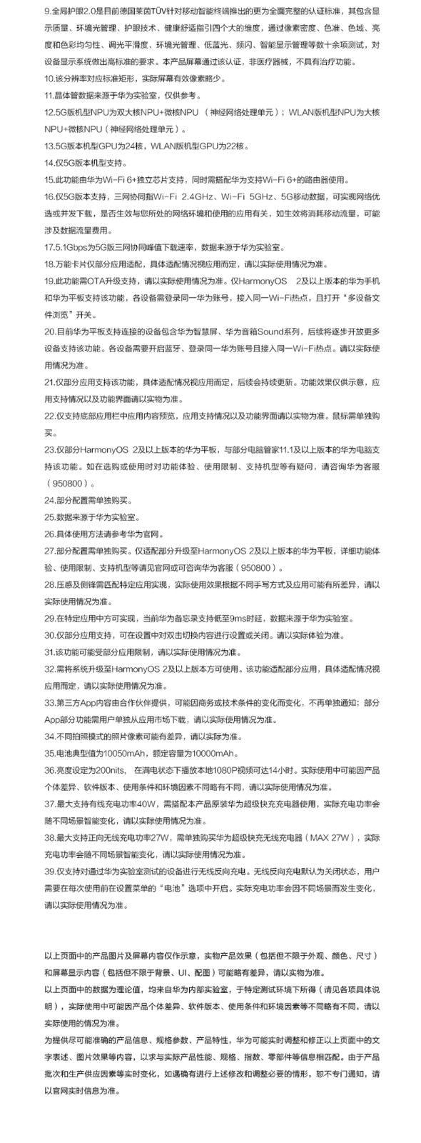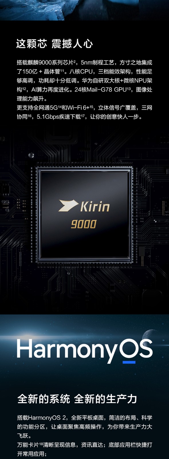 處理器型號信息 WIFI版:麒麟9000E;5G版:麒麟9000