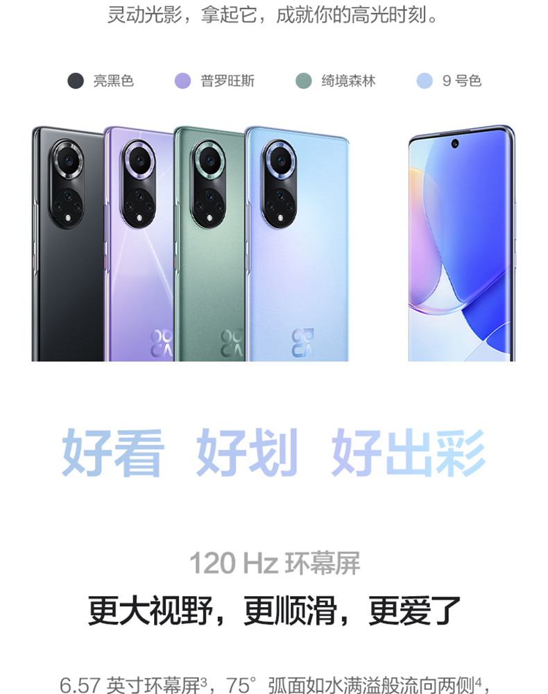 規(guī)格參數(shù) 拍照功能 后置攝像頭 5000萬(wàn)像素高清攝像頭 + 800萬(wàn)像素超廣角攝像頭+ 200萬(wàn)像素景深攝像頭+ 200萬(wàn)像素微距攝像頭 攝像頭類(lèi)型 后置四攝+前置單攝 顯示 分辨率 FHD+ 2340*1080 像素 屏幕尺寸 6.57英寸 網(wǎng)絡(luò) 網(wǎng)絡(luò)類(lèi)型 4G 全網(wǎng)通 網(wǎng)絡(luò)模式 雙卡雙待 機(jī)身詳情 款式 直板 存儲(chǔ) 存儲(chǔ)容量 8+128GB 8+256GB 基本參數(shù) 品牌 Huawei/華為 華為型號(hào) NOVA 9 CPU核心數(shù) 八核 機(jī)身顏色 9號(hào)色 普羅旺斯 綺境森林 亮黑色 手機(jī)類(lèi)型 智能手機(jī) 操作系統(tǒng) HarmonyOS CPU品牌 高通