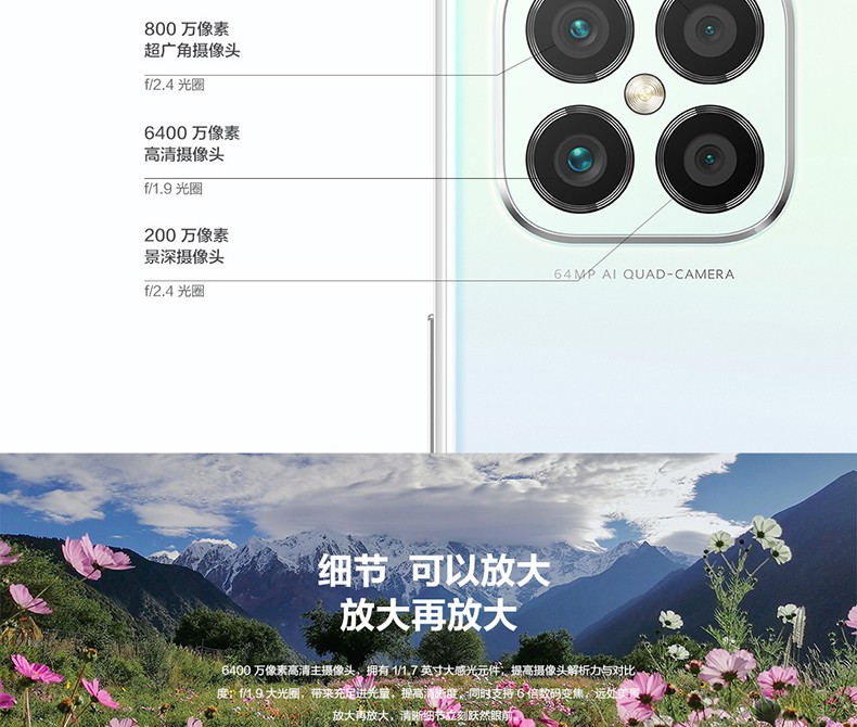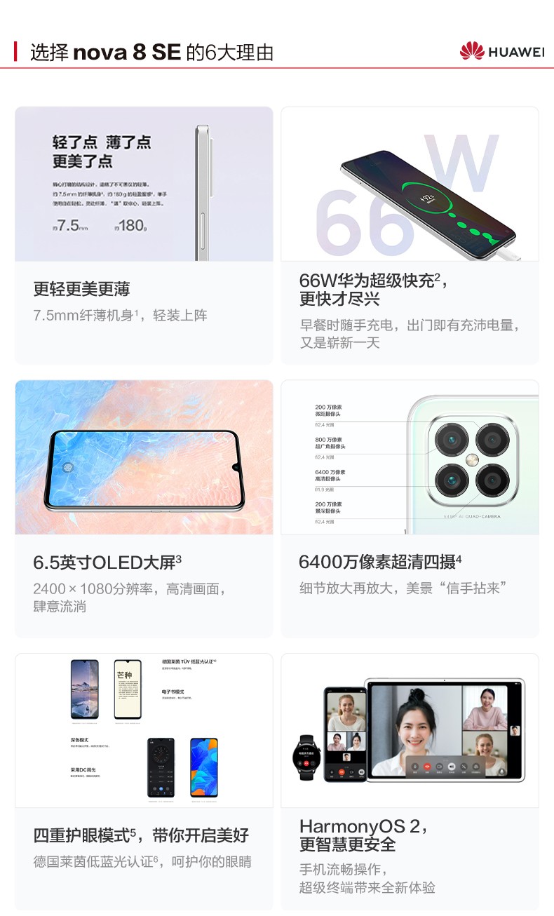 規(guī)格參數(shù) 拍照功能 后置攝像頭 6400萬像素攝像頭 + 800萬像素FF廣角攝像頭 + 200萬像素微距攝像頭 + 200萬像素虛化 攝像頭類型 前單+后四 顯示 分辨率 2400×1080 像素 屏幕尺寸 6.5英寸 網(wǎng)絡(luò) 網(wǎng)絡(luò)類型 4G 全網(wǎng)通 網(wǎng)絡(luò)模式 雙卡雙待 機(jī)身詳情 款式 直板 存儲 存儲容量 8+128GB 基本參數(shù) 品牌 Huawei/華為 華為型號 NOVA8 SE 機(jī)身顏色 櫻雪晴空 銀月星輝 深海藍(lán) 幻夜黑 手機(jī)類型 拍照手機(jī) 智能手機(jī) 4G手機(jī) 操作系統(tǒng) HarmonyOS CPU品牌 海思
