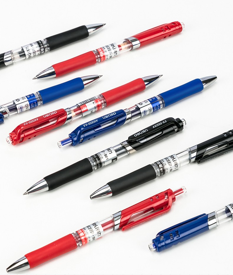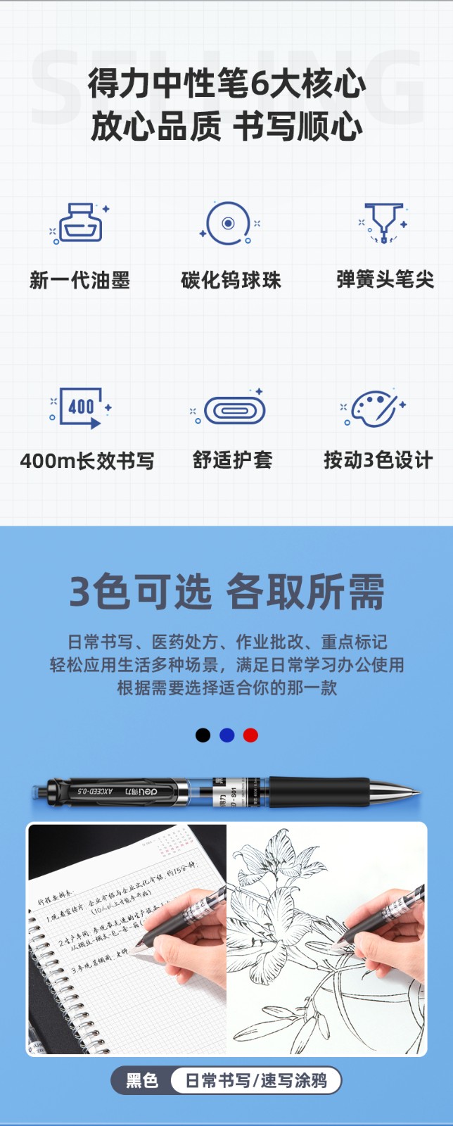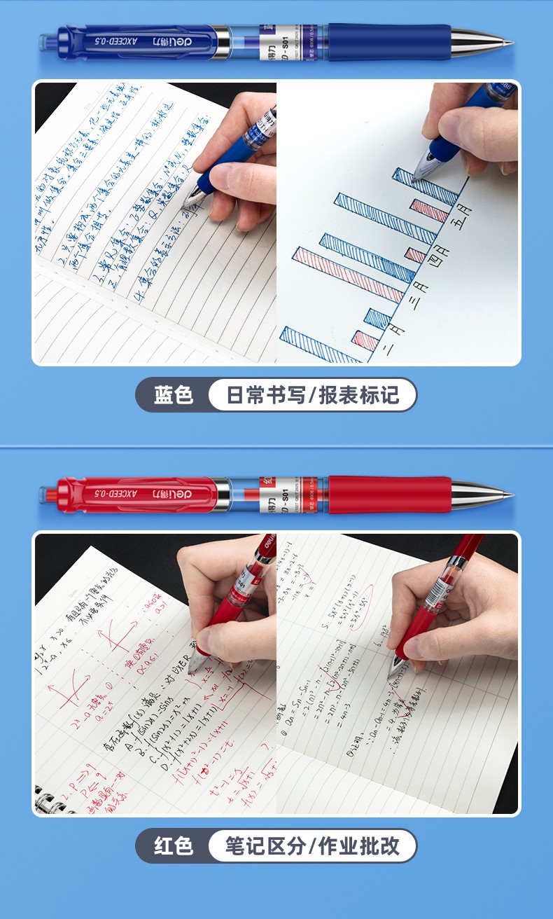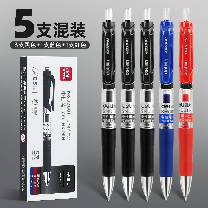 5支混裝-得力按動(dòng)筆中性筆水筆學(xué)生用考試按壓式子彈頭碳素黑色水性簽字筆芯05mm圓珠筆藍(lán)黑紅筆教師辦公文具用品