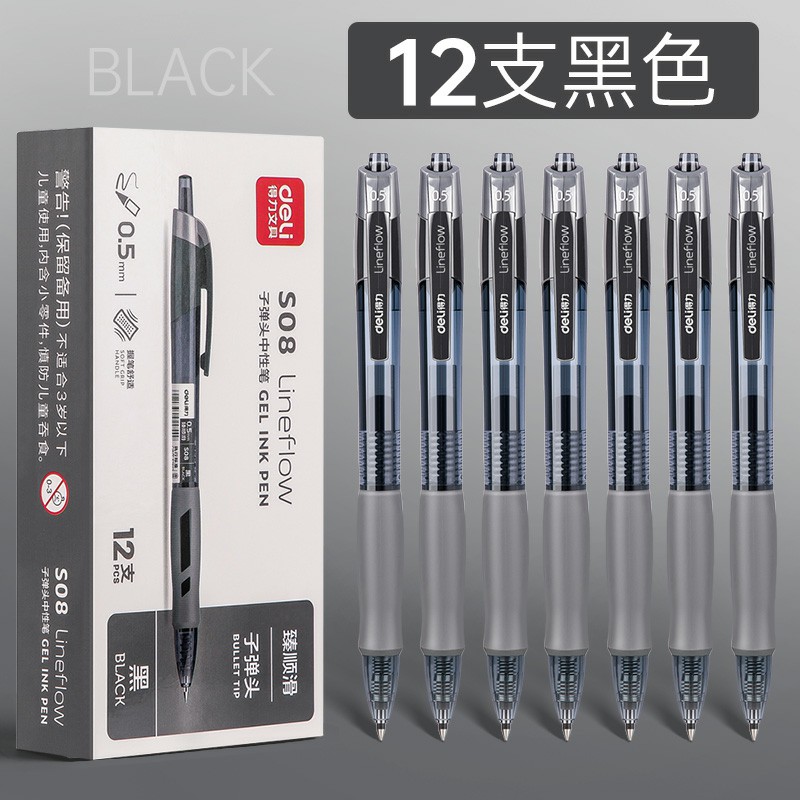 12支黑色-得力按動筆中性筆水筆學(xué)生用考試按壓式子彈頭碳素黑色水性簽字筆芯05mm圓珠筆藍(lán)黑紅筆教師辦公文具用品